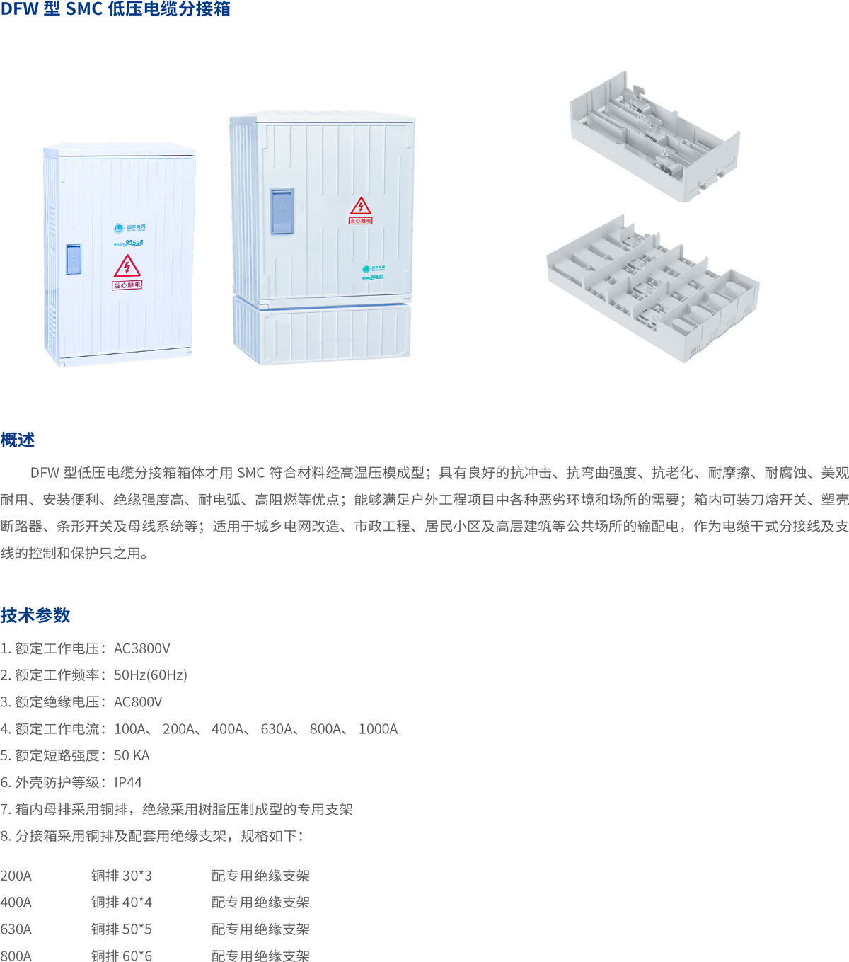 DFW型低壓電纜分接箱箱體采用SMC符合材料經(jīng)高溫壓模成型;具有良好的抗沖擊、抗彎曲強(qiáng)度、抗老化、耐摩擦、耐腐蝕、美觀耐用、安裝便利、絕緣強(qiáng)度高、耐電弧、高阻燃等優(yōu)點(diǎn);能夠滿足戶外工程項(xiàng)目中各種惡劣環(huán)境和場(chǎng)所的需要;箱內(nèi)可裝刀熔開關(guān)、塑殼斷路器、條形開關(guān)及母線系統(tǒng)等;適用于城鄉(xiāng)電網(wǎng)改造、市政工程、居民小區(qū)及高層建筑等公共場(chǎng)所的輸配電,作為電纜干式分接線及支線的控制和保護(hù)只之用。
