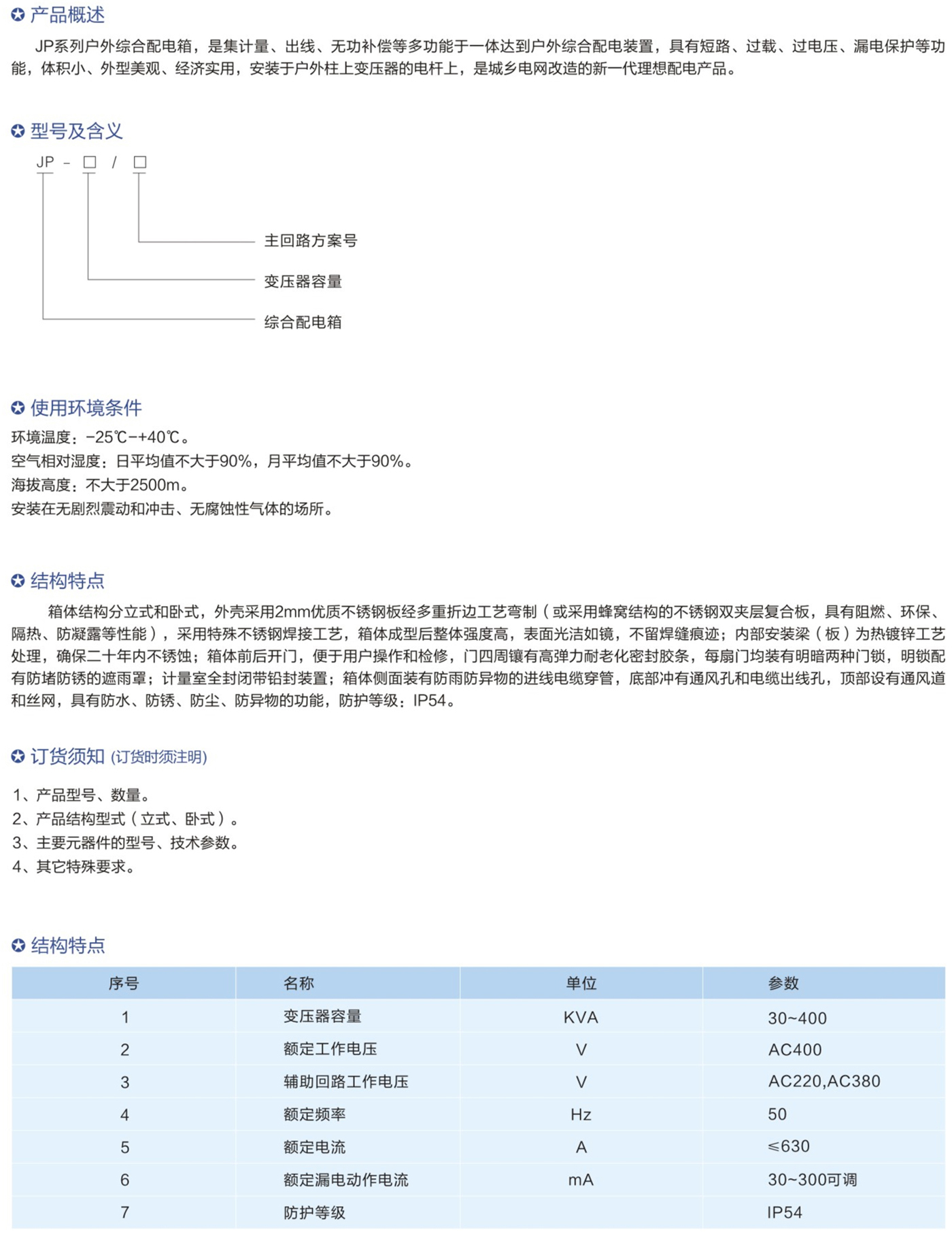 JP戶外綜合配電箱是集計量、出線、無功補償?shù)榷喙δ苡谝惑w的,戶外綜合配電裝置;集短路、過載、過電壓、漏電等保護功能 ;體積小、外型美觀...