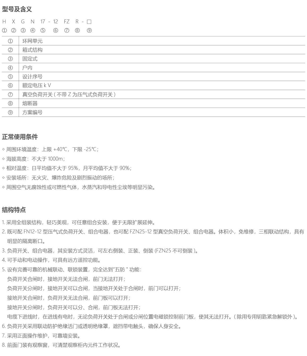 符合 GB3906《3.6~40.5 交流金屬封閉開關(guān)設(shè)備和控制設(shè)備》,符合國際標準 IEC298《交流金屬封閉開關(guān)設(shè)備和控制設(shè)備》的要求。并具有“五防”聯(lián)鎖功能。