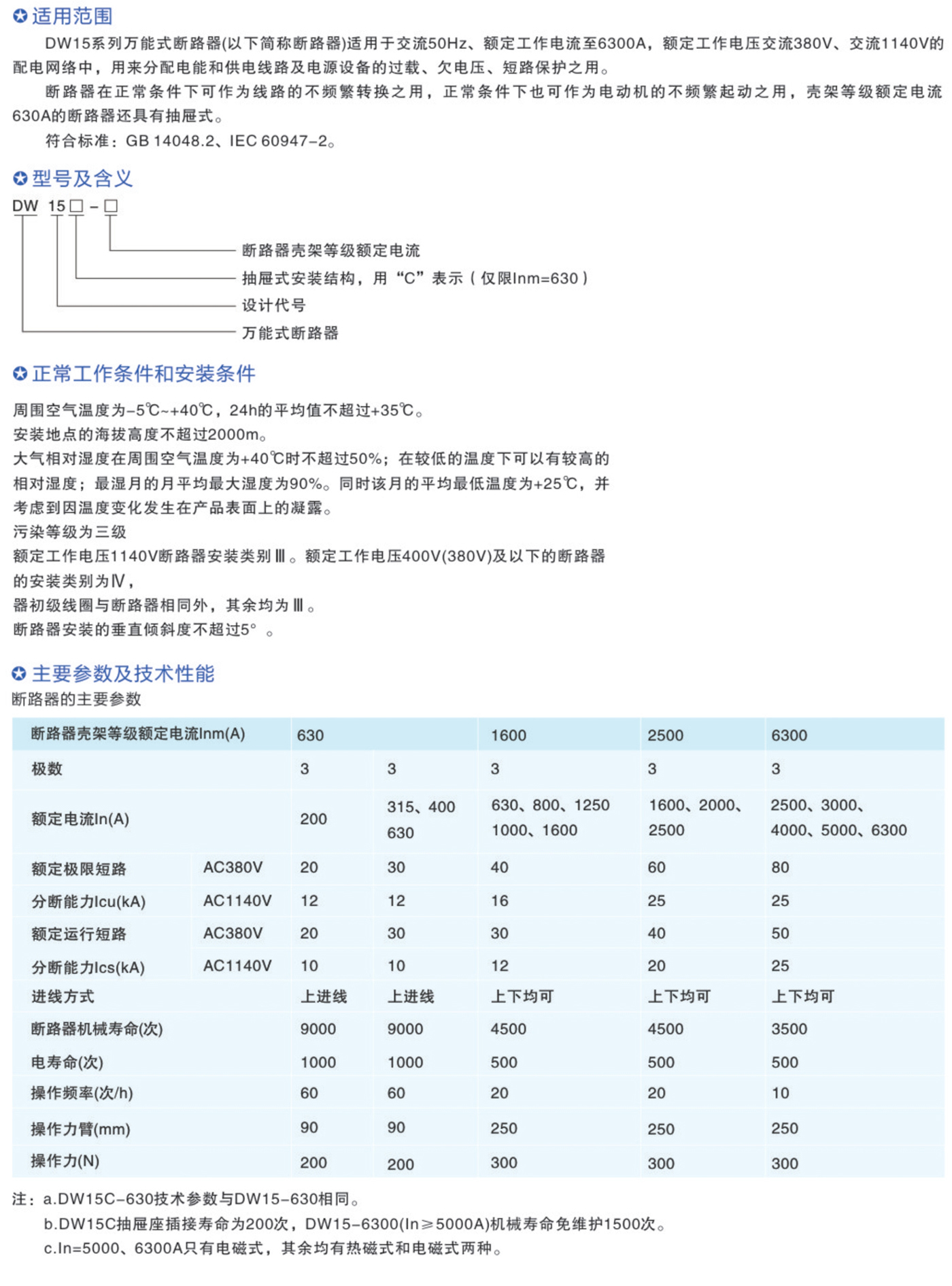 DW15系列萬能式斷路器 是用于交流50Hz、額定電流200A至6300A、額定電壓380V或1140V的配電網(wǎng)絡(luò)中的關(guān)鍵設(shè)備,主要用于電能分配及線路/設(shè)備的過載、欠電壓、短路保護(hù)...