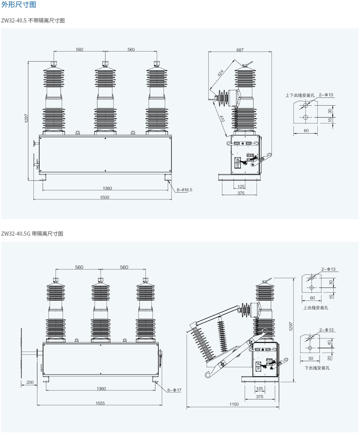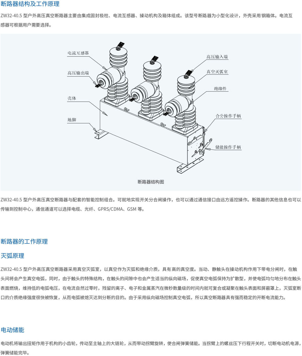 ZW32-40.5系列戶外高壓真空斷路器采用了設計的一體式固封柱和高可靠性的操作機構。該裝置主要應用于中壓架空線電網(wǎng),作為分、合負荷電流、過載電流、短路電流之用。