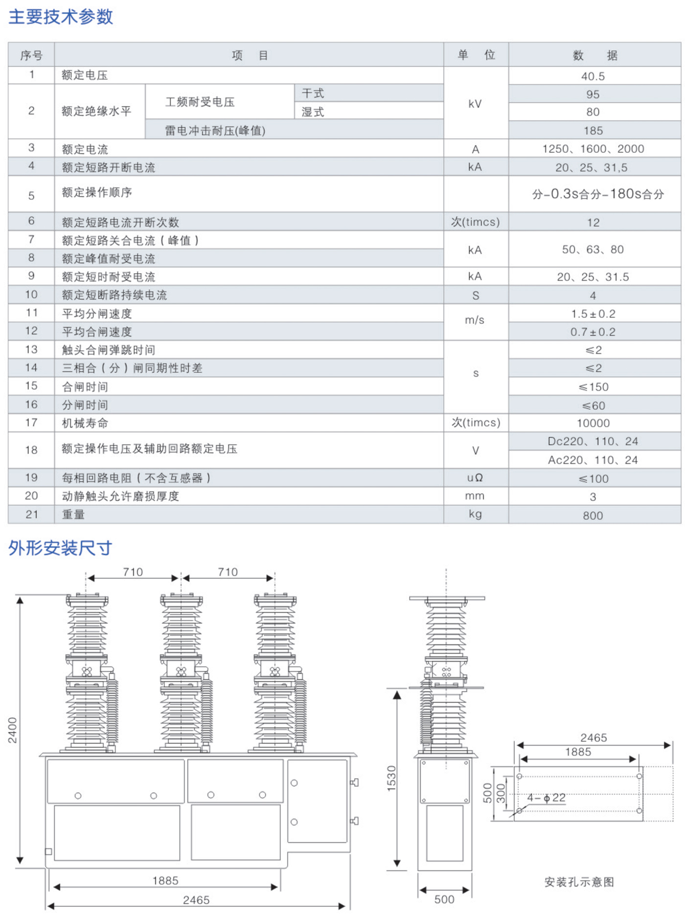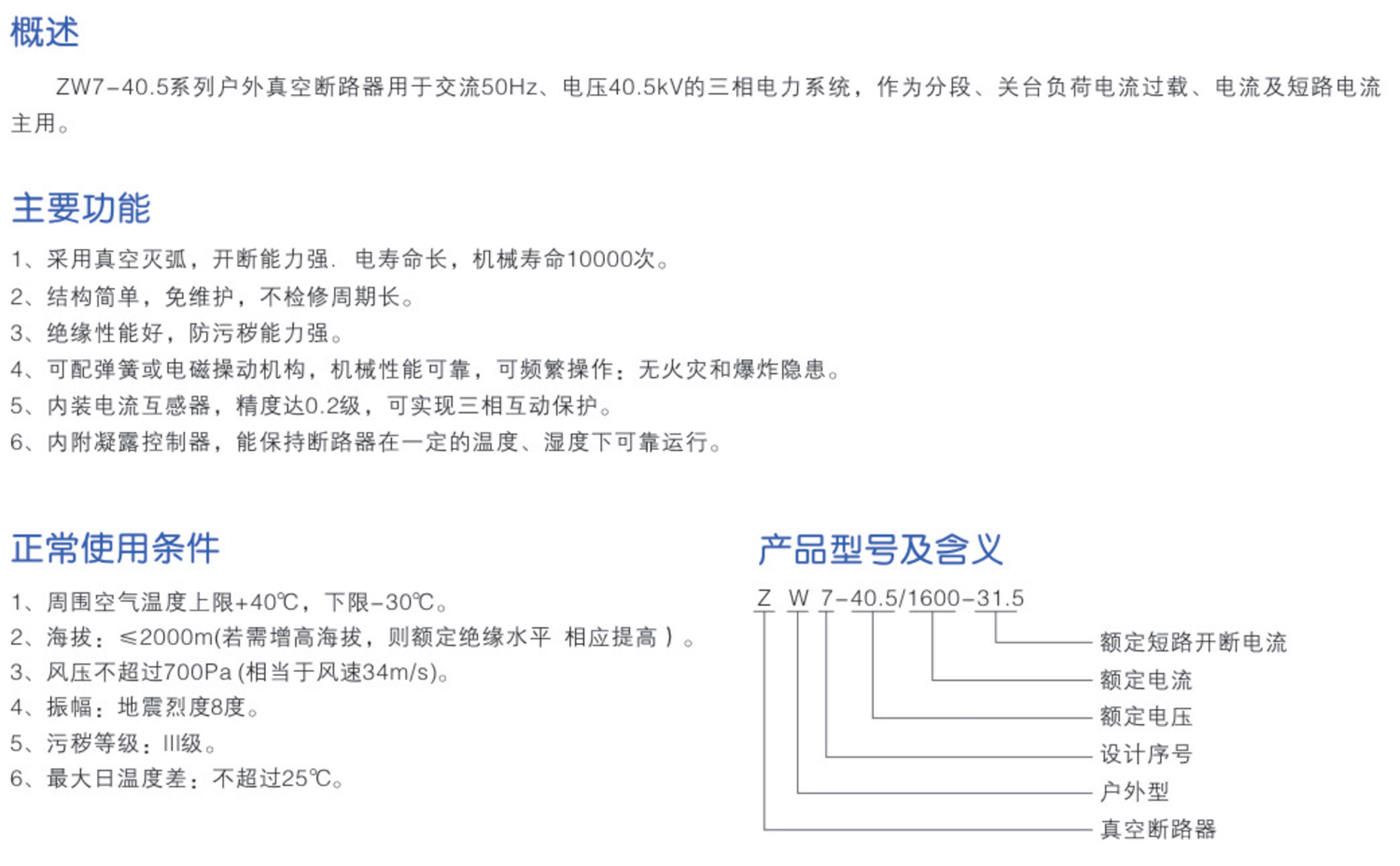 ZW7-40.5系列戶外高壓真空斷路器(以下簡稱“斷路器”)用于交流50Hz、額定電壓40.5kV的三相電力系統(tǒng)中,作為分、合負荷電流、過載電流及短路電流之用...