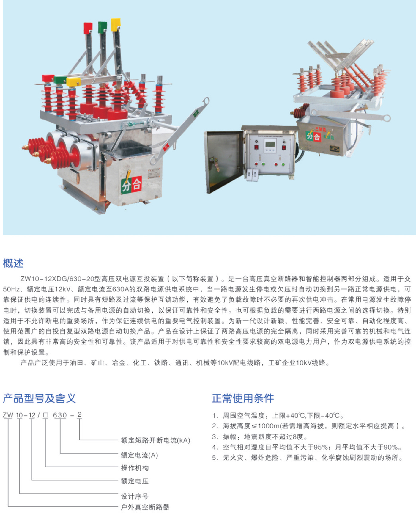ZW10-1I-12G/630-20型高壓雙電源切換裝置是由一臺高壓真空斷路器和智能控制器兩部分組成。應(yīng)用于交流50赫茲,額定電壓12kV,額定電流至630A的雙路電源供電系統(tǒng)中,當(dāng)一路電源發(fā)生停電或欠壓時切換到另一路正常電源供電,可靠保證供電的連續(xù)性...