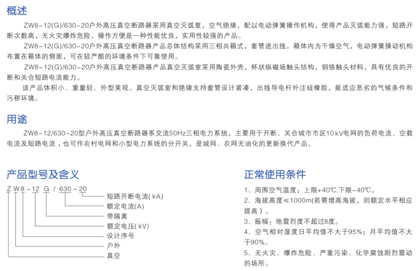 ZW8-12(G)型戶外高壓真空斷路器,三相交流50Hz的戶外高壓開關(guān)設(shè)備。由操動、導(dǎo)電回路、絕緣系統(tǒng)、密封件及殼體組成,整體結(jié)構(gòu)為三相共箱式。用于10kV農(nóng)網(wǎng)和城網(wǎng)電力系統(tǒng),作為分、合負荷電流、過載電流、短路電流及其他類似場所之用...